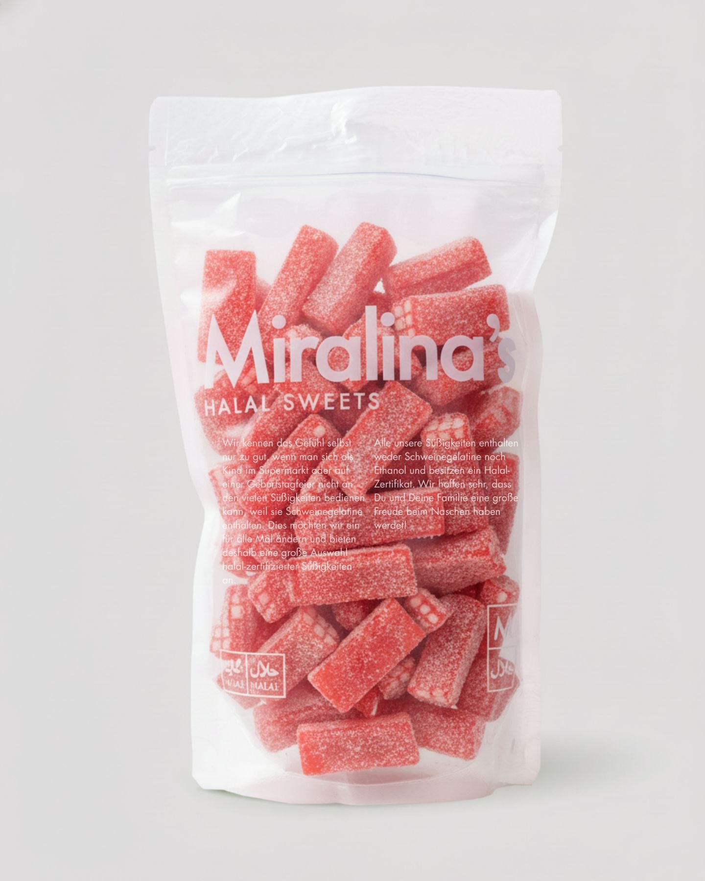 Die Miralina's Brixx mit leckerem Erdbeer-Geschmack. Diese Süßigkeiten werden ohne tierische Gelatine hergestellt und sind vegan.